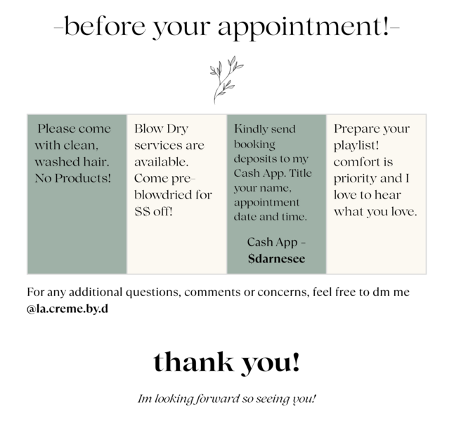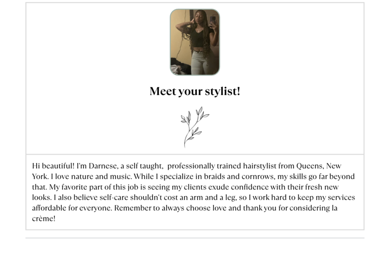 Hi beautiful! I'm Darnese, a self taught, professionally trained hairstylist from Queens, New York. I love nature and music. While I specialize in braids and cornrows, my skills go far beyond that. My favorite part of this job is seeing my clients exude confidence with their fresh new looks. I also believe self-care shouldn't cost an arm and a leg, so I work hard to keep my services affordable for everyone. Remember to always choose love and thank you for considering la crème!Galeria