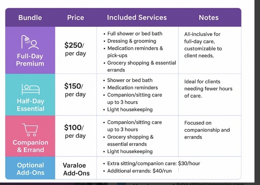 > Full Day "All-in-One CarePackage” - $210 Our most popular full-service daily bundle (up to 8 hours)Includes: • Full personal care (shower, grooming, dressing, hygiene) • Medication support (pickup + reminders) • Light meal prep • Light housekeep