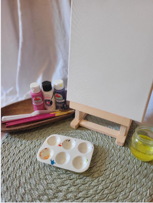 Package comes with :Two 8x10 Blank Canvas Paint brushes Misc colors of Acrylic Paint Easels