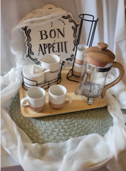 Comes with Coffee carafe, hot coffee, creamer, sugar and 4 mini cups.