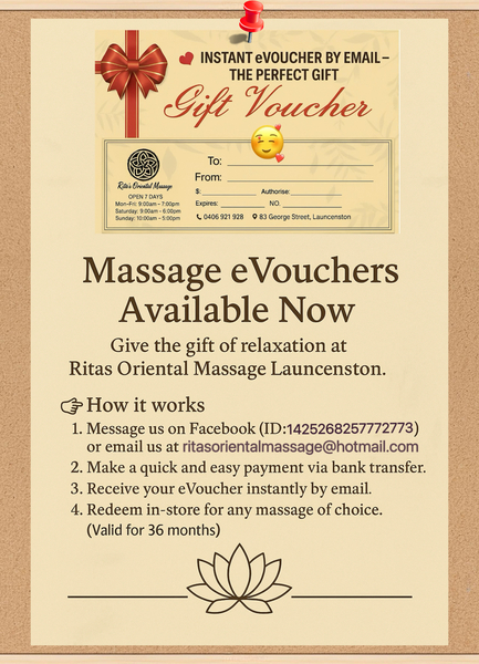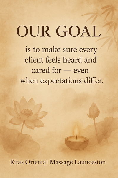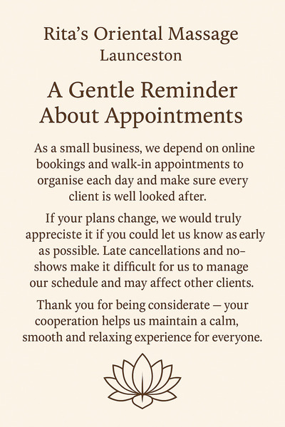 Rita’s Oriental Massage Launceston is your destination for relaxation, wellness, and rejuvenation in the heart of Launceston. Our experienced therapists provide personalized treatments designed to meet your unique needs—whether it’s deep relaxation, tension relief, or remedial care.We offer a range of services including body massage (dry, oil, remedial), whole body & feet treatments, foot spa & reflexology, and targeted therapy massage. Every session is delivered in a clean, tranquil, and welcoming environment, ensuring you leave feeling refreshed, balanced, and renewed.At Rita’s, we believe wellness should be accessible and enjoyable. Conveniently located with flexible appointment times, we make it easy for you—or someone special—to experience the benefits of expert care and personalised massage therapy.Galeria