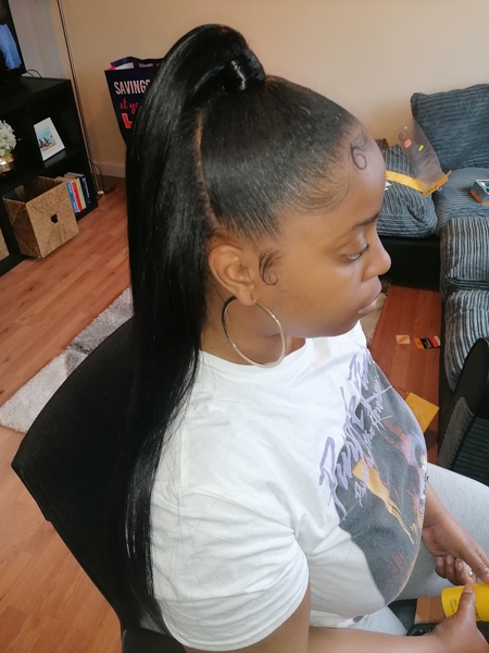 Service includes:Sleek ponytail with 1 sew in track (you can add up to 3)