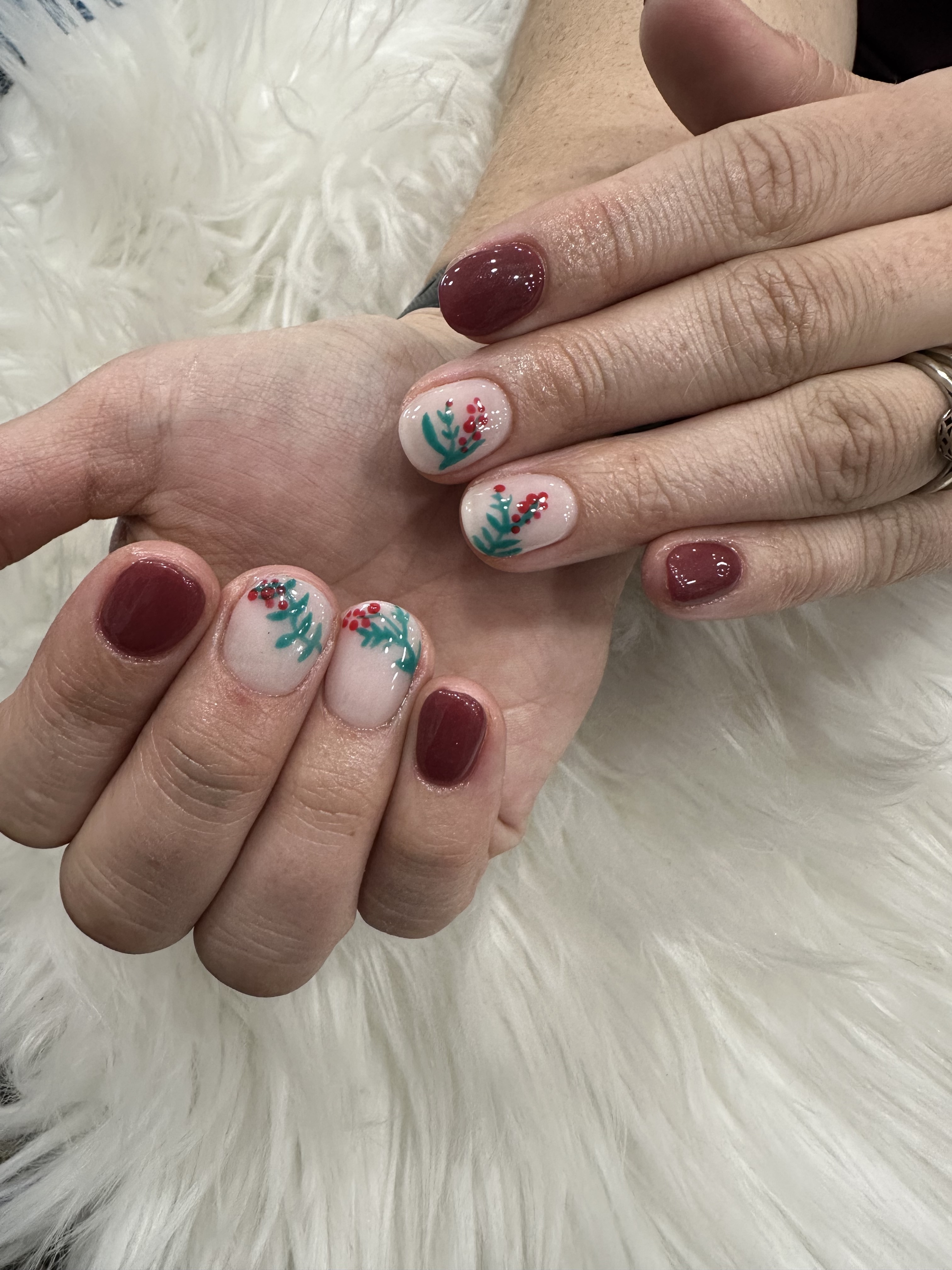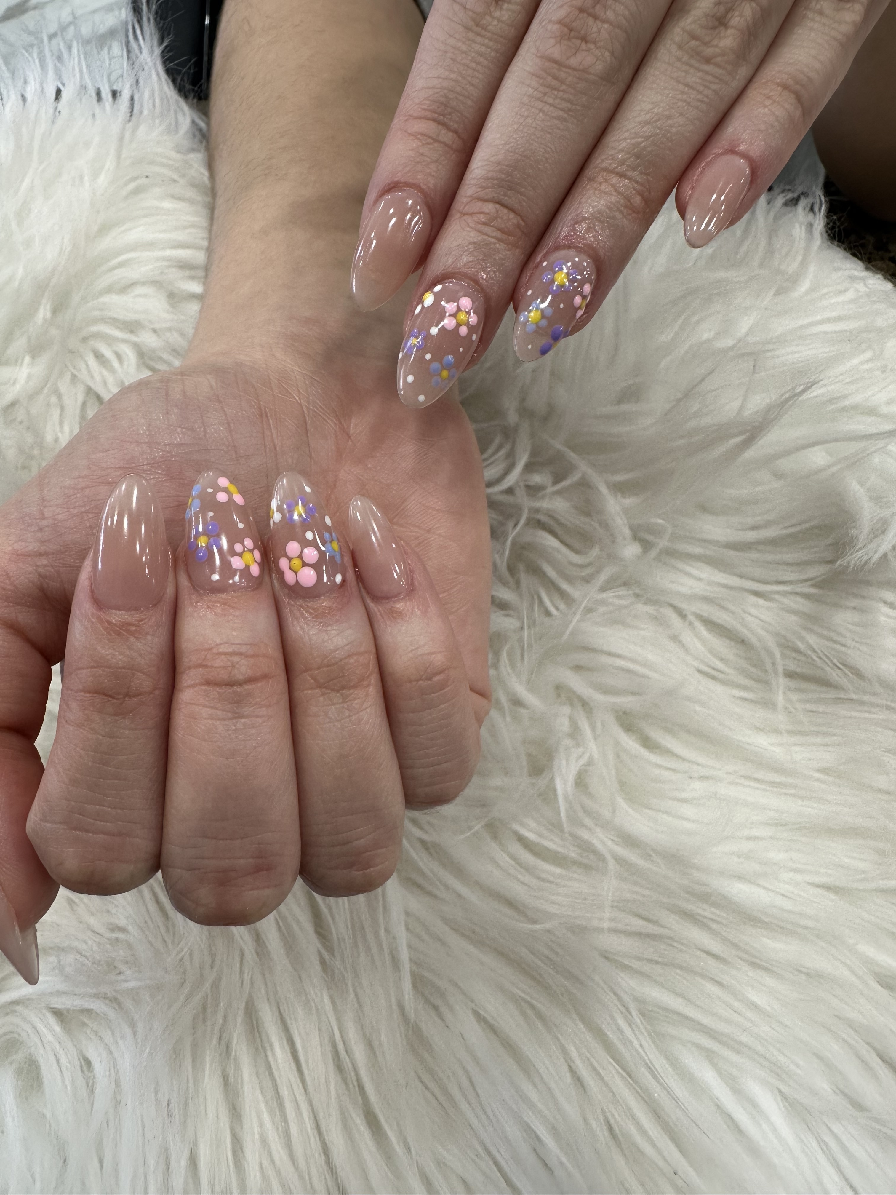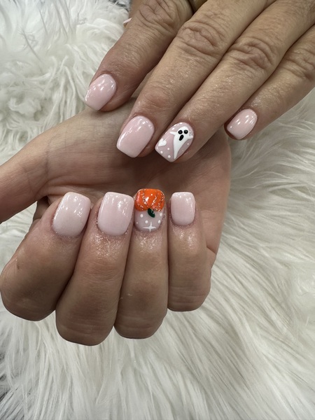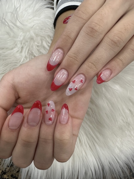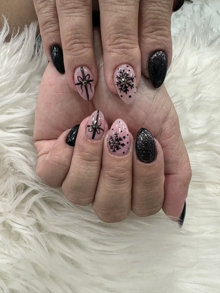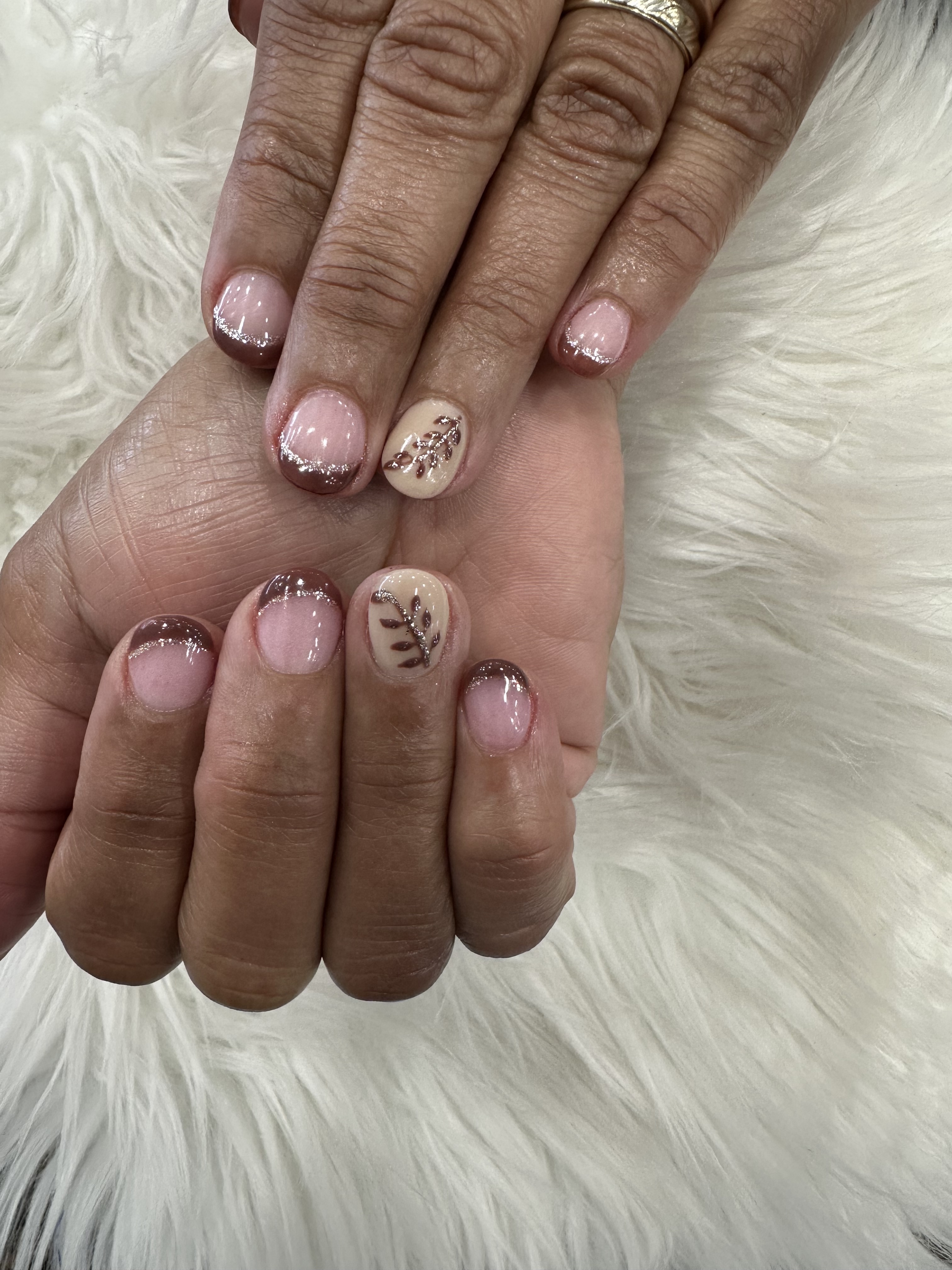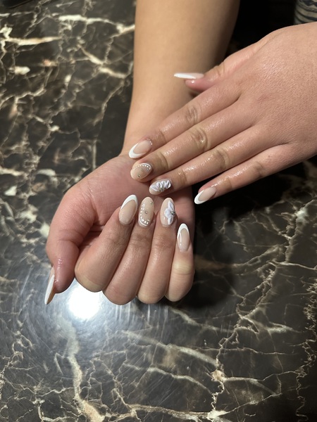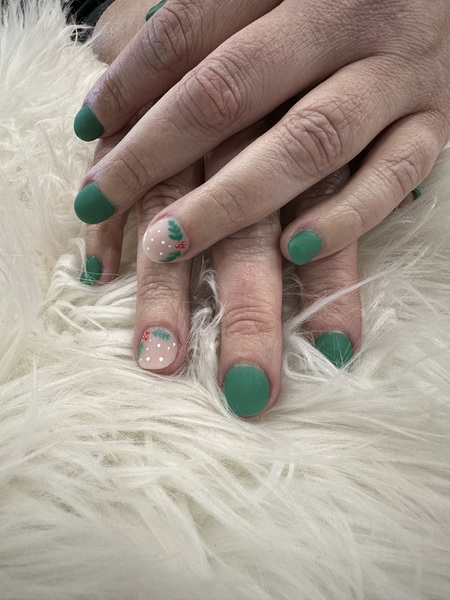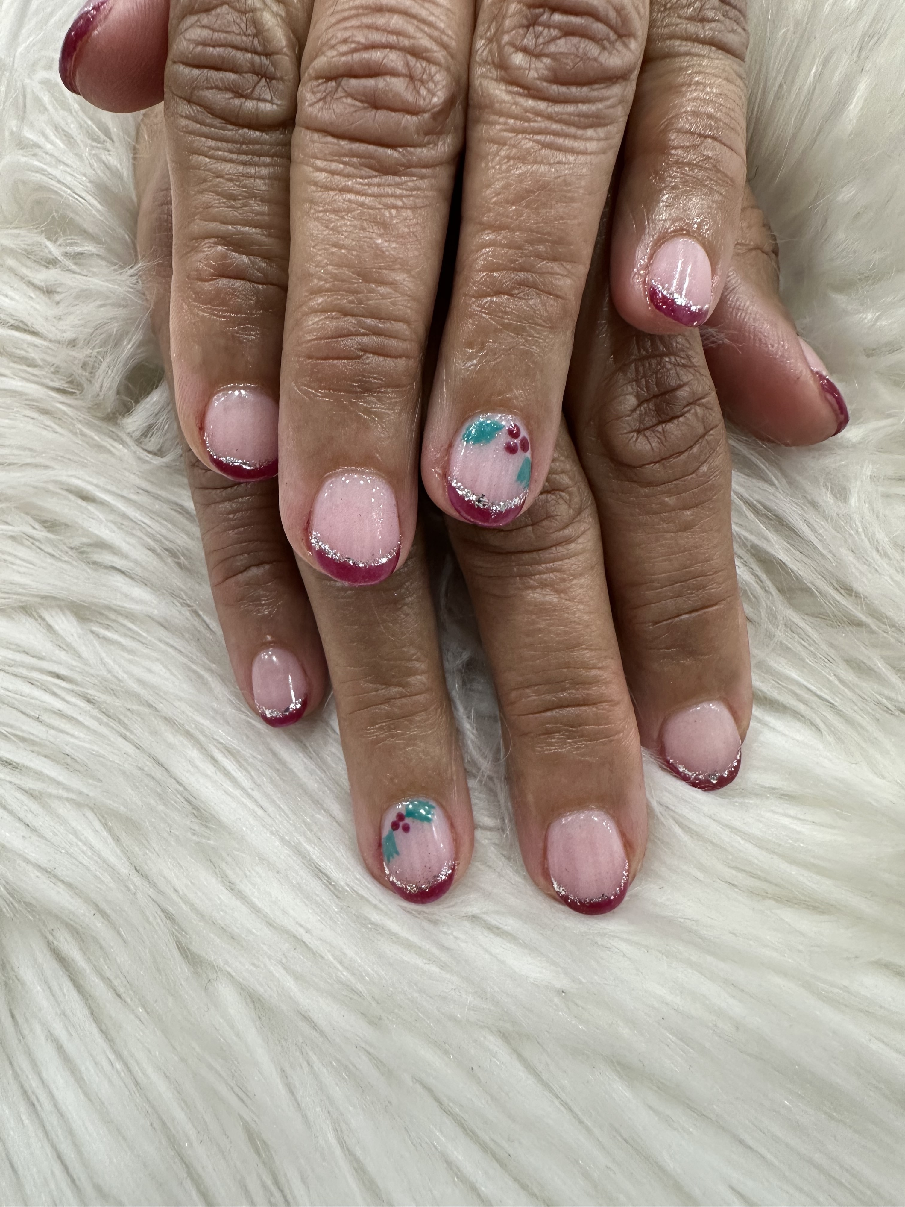 Gel on natural nail. Designs can be added on.