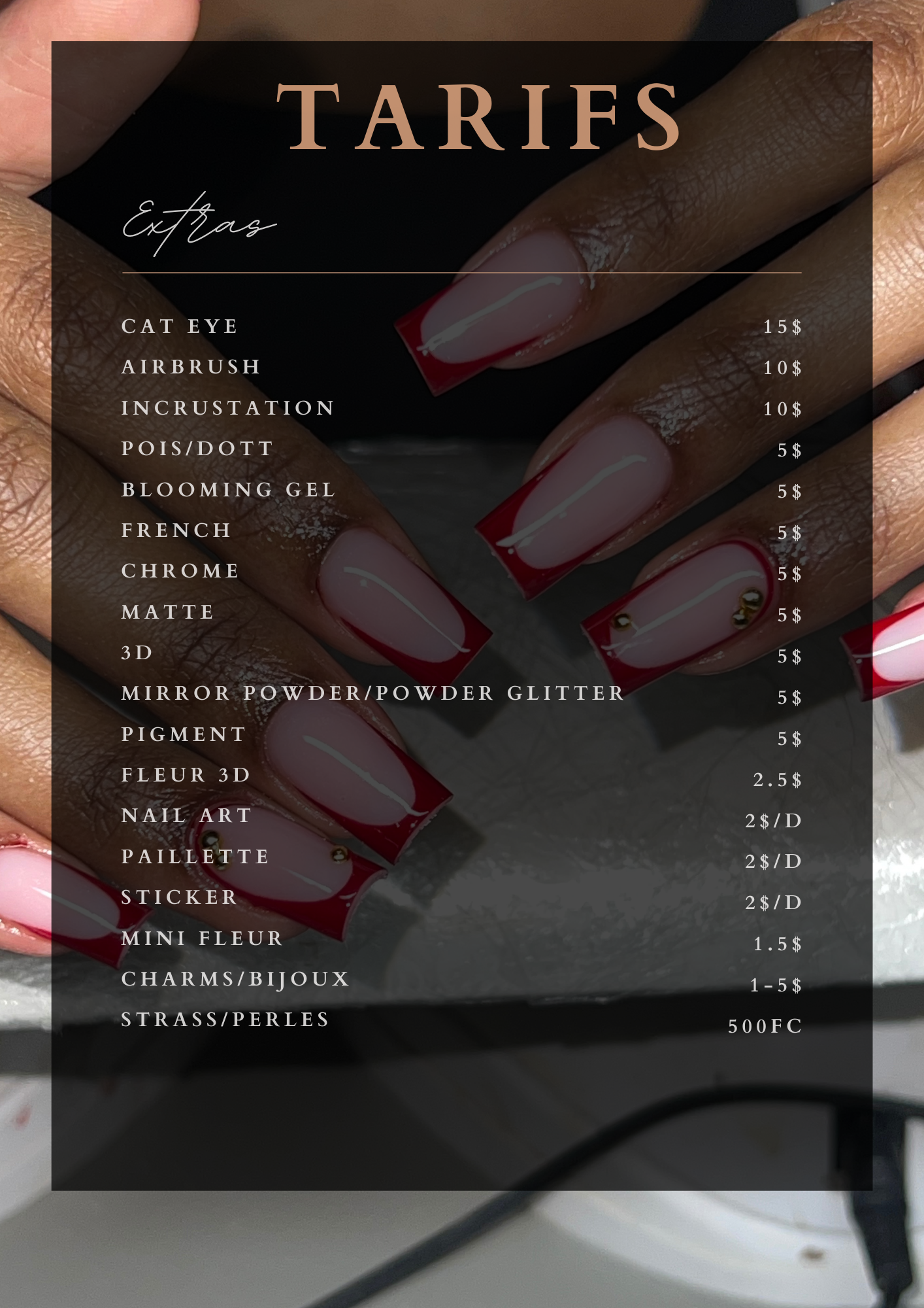 Coût: 75$ SANS LES EXTRAS (voir la grille tarifaire) 55$ les mains et 20$ les pieds