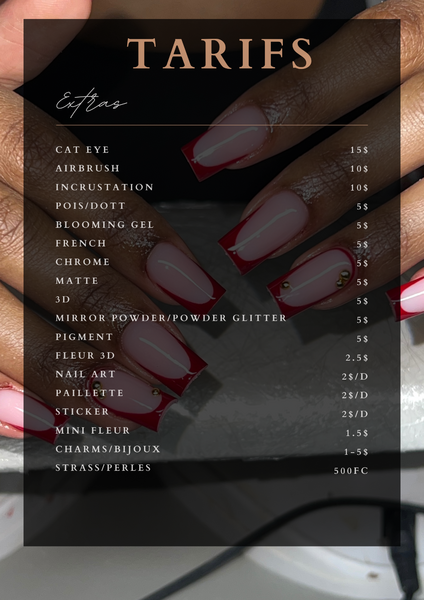 Coût: 50$ SANS LES EXTRAS (Voir grille tarifaire dans la galerie) 30$ pour les mains et 20$ pour les pieds
