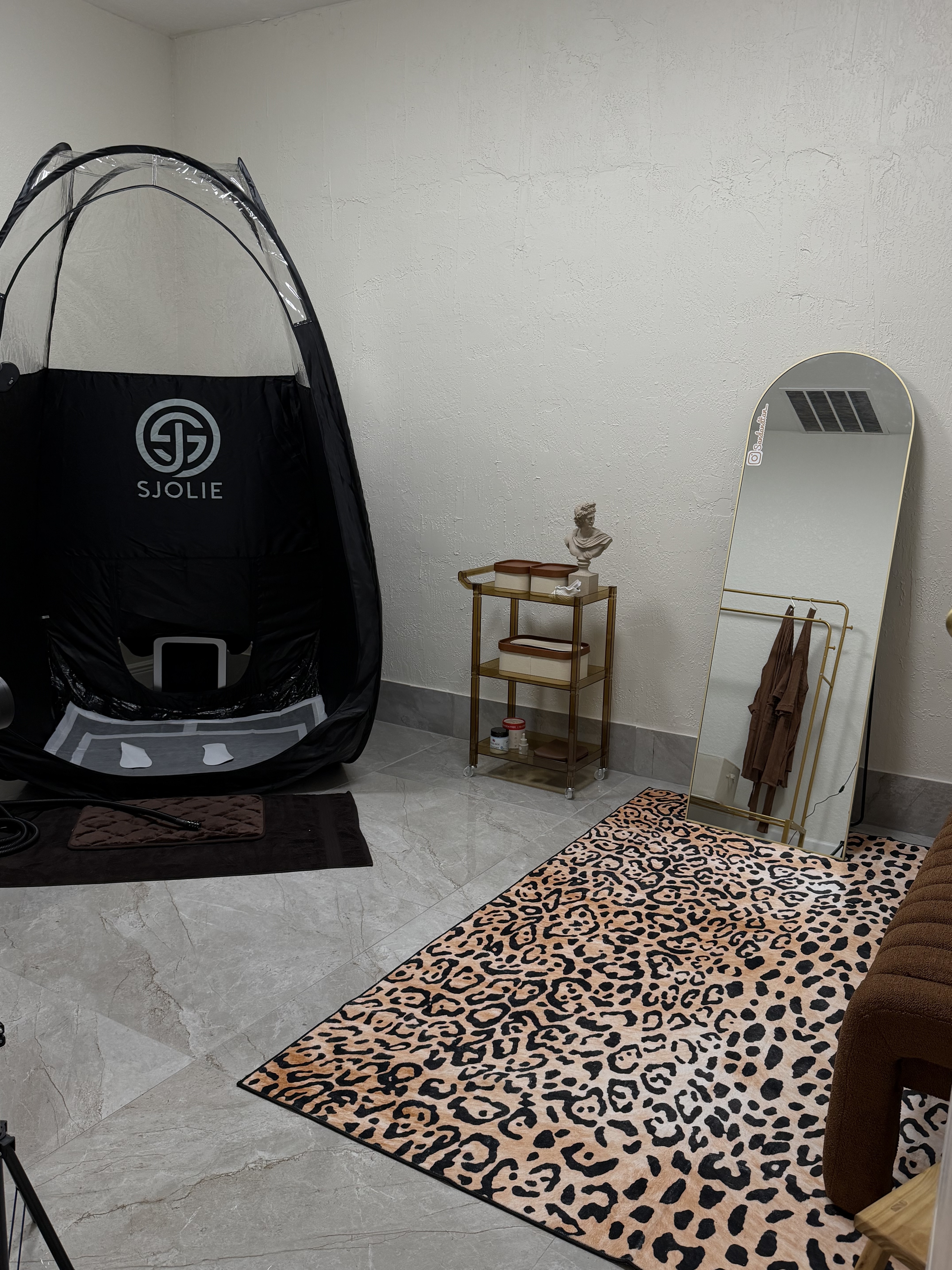Step into my office for a custom in-studio spray tan. We start with a skin balancing prep spray, then apply a personalized glow using high-end formulas tailored to your tone. After a flawless application, a silky drying powder is added for comfort. Y