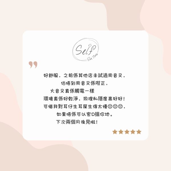 【預約後,必須先付款再WhatsApp確認】approx. 60 mins內視鏡耳道檢查及講解放鬆前奏及清理耳垢沉浸式耳浴耳內ASMR享受及耳部按摩套票:$225/5次(可與親友共享,期限為六個月)