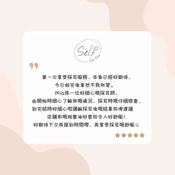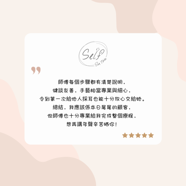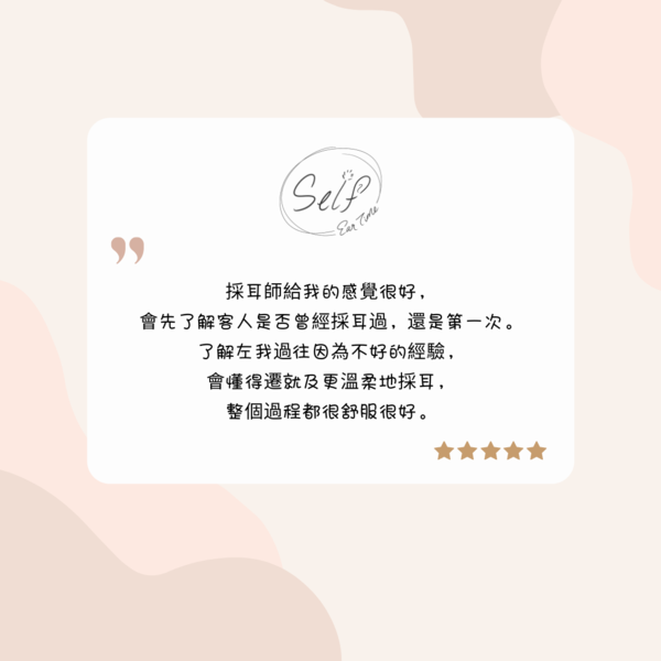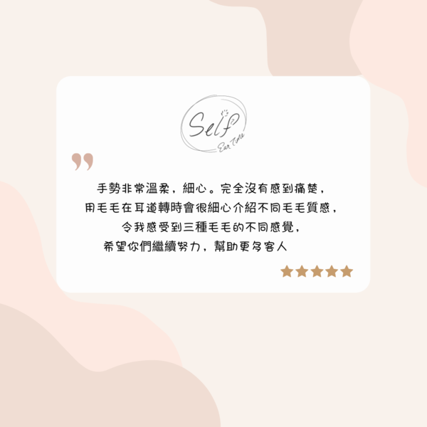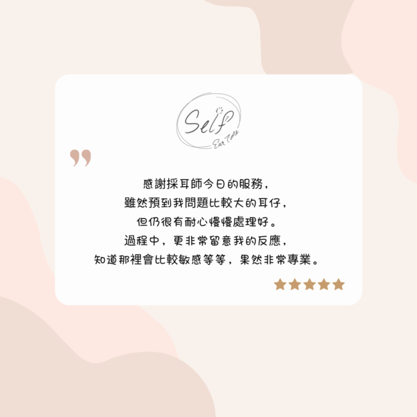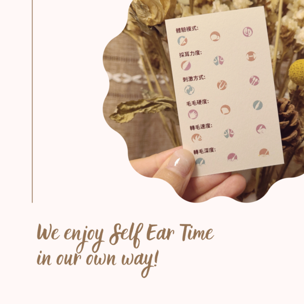 本店是香港首間採耳專門店,我們除了提供耳道清潔護理,還會運用各種傳統工具和專業手法,刺激耳部神經和穴位,達致顱內高潮和身心舒壓的效果。我們希望每位客人好好享受一個人的採耳時光,並在體驗服務後,帶著愉快的心情和輕飄飄的步伐離開。This is Hong Kong's first professional ear spa center. We provide professional ear cleaning treatment, and more than that, we use Chinese traditional tools and professional skills to stimulate nerves and acupoints around and inside the ears, creating the effect of ASMR and full relaxation. We hope our clients would enjoy their "Self Ear Time" here, and finish with a pleasant, relaxing feeling.作品圖集