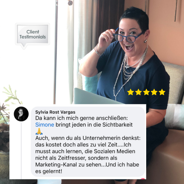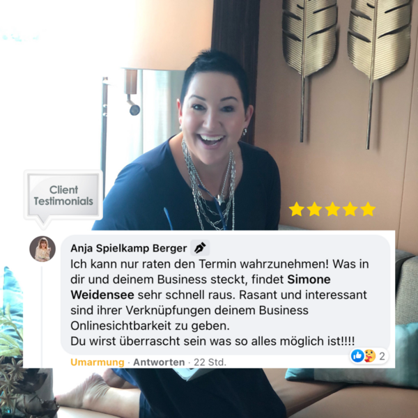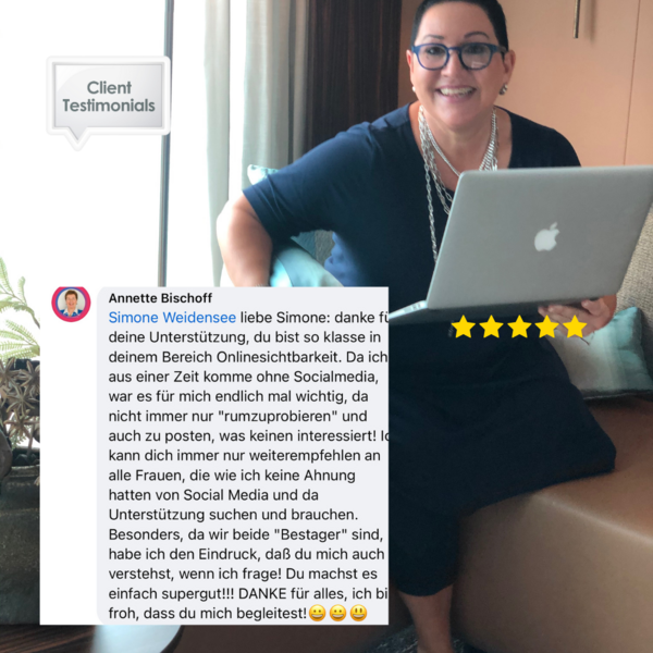 Von analog zu digital – mit Stil und Substanz!Hallo, ich bin Simone Weidensee, die Gründerin der Social Media Marketing Akademie der „Best Ager Lounge“ – ein virtueller Ort, wo selbständige, ambitionierte und erfolgreiche Frauen in der Lebensmitte, wie Du, lernen Ihre Expertise auch Online Sichtbar zu machen um im Netz Kunden zu gewinnen.Was ist die Social Media Marketing Akademie der Best Ager Lounge? Die Social Media Marketing Akademie der Best Ager Lounge ist ein spezialisiertes Online Weiterbildung-Portal, das darauf abzielt, selbständige, ambitionierte und erfolgreiche Frauen über 50 dabei zu unterstützen, ihre Expertise in der digitalen Welt sichtbar zu machen. Die Akademie bietet maßgeschneiderte Schulungen und persönliches Mentoring, um den Bedürfnissen ihrer speziellen Zielgruppe gerecht zu werden.Für wen ist die Akademie gedacht? Die Angebote richteten sich an Frauen, die in ihrem Offline-Businesses bereits erfolgreich sind und nun auch online erfolgreich sein möchten. Sie spricht insbesondere diejenigen an, die ihre digitale Präsenz etablieren und dominieren wollen, um Kunden zu gewinnen und den Umsatz zu steigern.➡️ Du bist eine Frau in der Lebensmitte und möchtest mit Deinem Herzensbusiness auch Online gefunden werden?Du bist hier genau richtig!👉 Wenn Du Dich im digitalen Dschungel verloren fühlst.👉 Du siehst, wie andere in der Online-Welt Erfolge feiern und Du scheinst dort nur Zeit zu verbrennen.👉 Du fragst Dich, warum Deine eigene Social Media Präsenz keine oder kaum Kunden anzieht? 👉 Wenn Du über Social Media Kunden gewinnen möchtest und Deine Marke mit Dir im Fokus authentisch Umsatz generieren soll, dann sollten wir reden.Was uns unterscheidetIndividuelle 1:1-Betreuung: Persönlich zugeschnitten, damit Du Dich königlich betreut fühlst.Zielgruppenspezifische Expertise: Spezialisiert auf erfolgreiche Frauen 50 Plus.Flexible Lernmöglichkeiten: Angepasst an Deine individuellen Bedürfnisse und Zeitpläne.🔍 Warum eine Sichtbarkeitsanalyse buchen?Entdecke, wie Sichtbar Du wirklich bist.Deine Online-Strategien entscheiden über Erfolg oder Stillstand. Eine professionelle Analyse deckt auf:✨ Status-Check: Lass uns einen tiefen Einblick in Deine Social Media-Welt nehmen und herausfinden, wo Du stehst!🎯 Chancen-Spotter: Wir spüren versteckte Lücken und glänzende Möglichkeiten auf, die nur darauf warten, von Dir genutzt zu werden.📘 Exklusive Strategien: Bekomme wertvolle, individuell angepasste Strategien, die speziell für Deinen Erfolg entworfen sind.Was beinhaltet Deine Gratis Sichtbarkeitsanalyse?✅ Umfassender Check-up Deiner aktuellen Social Media-Präsenz: Wir schauen uns an, wie Du derzeit im Netz dastehst. Warum gewinnst Du im Netzt nicht genug Kunden?✅ Identifikation von Lücken und Potentialen: Wir finden die Bereiche, in denen Du glänzen könntest, aber es noch nicht tust.✅ Strategische Empfehlungen: Du erhältst konkrete, umsetzbare Ratschläge, die auf Deine individuelle Situation zugeschnitten sind.✅ Wir schauen uns auch an, welche Möglichkeiten es für Dich gibt, nachhaltigere und schnellere Erfolge zu erzielen, wenn Du z.B. meine Hilfe in Anspruch nimmst. Transparent und radikal ehrlich.Bist Du bereit, aus dem Schatten zu treten und die Scheinwerfer auf Deine Expertise zu richten? Um endlich auf Social Media nicht nur Zeit zu verbrennen, sondern dort auch endlich Umsatz zu generieren. Klicke jetzt auf den Button und buche Deine kostenlose Sichtbarkeitsanalyse. Lass uns gemeinsam Deine digitale Präsenz zum Leben erwecken und Deine Leidenschaft in sichtbare Erfolge umwandeln.Bis dahin Deine Simone WeidenseeOnline-Marketing ist meine große Leidenschaft.Mentorin, KI-Trainerin und Business-Wegbegleiterin für Frauen in der Lebensmitte Social Media Erfolg ist keine Fragen des Alters! "online marketing coach" "social media marketing kurs" "social media lernen" "social media kurs""social media beratung" "fortbildung social media""weiterbildung social media marketing""online marketing lernen" "social media unterstützung" "unterstützung social media"Gallery