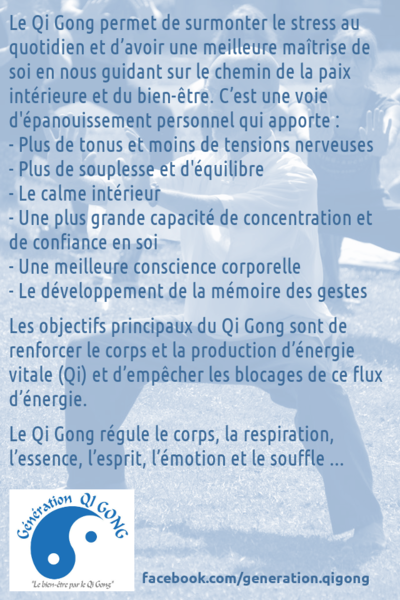 After-work Qi Gong (cours hebdomadaires)Qi Gong pour se ressourcer après le travail ...En relâchant les tensions, le Qi Gong (cet art énergétique d'origine chinoise) reconnecte le corps à son énergie vitale. Meilleure concentration, relaxation, flexi