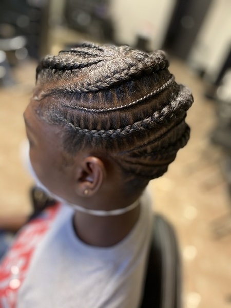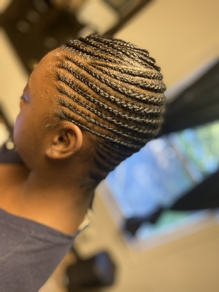 First two braids along perimeter of hair line and last row of braids along the nape/back of hair. Hair must be taken down & washed prior to arrival. **Take down and wash can be added on