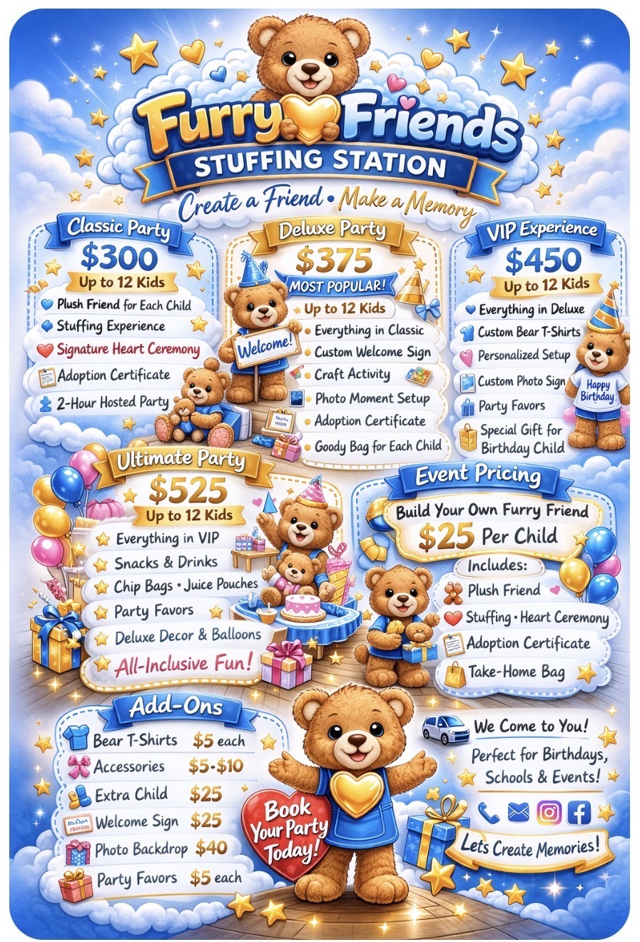 Looking for a unique party experience? Furry Friends Stuffing Station brings the fun to YOU! ✨Kids create their own plush friend, participate in a heart ceremony, and leave with a memory they’ll never forget.Create a Friend. Make a MemoryGaleria