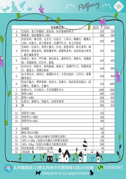 美 容 價 目 表A芝娃娃、意大利靈提、迷你品、玩具曼徹斯特犬$330B積羅素、迷你臘腸犬<=5KG$390C比熊犬、貴婦犬、貝林登爹利$550D約瑟爹利、魔天使、北京犬、松鼠犬、八哥犬、西施犬、蝴蝶犬、臘腸犬>5KG、拉薩犬、波士頓爹利、法國鬥牛犬、長毛芝娃娃$450E哥基犬、史納沙、比高犬、查理士獵犬、沙皮、凱恩爹利、絲毛爹利、湖畔爹利、羅福爹利、蘇格蘭爹利、威爾斯爹利、西部高地白爹利、鋼毛獵狐爹利 $550F柴犬、銀狐$580G拉布拉多、斑點犬、凱利藍梗、都柏文、英國鬥牛犬、英