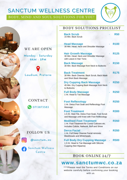 Full Body Head to Toe Massage With Dry back cuppingHygiene is Prioritized: With Ongoing Water Issues & illnesses easily passed onBring in your own 2 x Bath Towels and Get R25 OFF!!!Full Body Massage with Silicone Cupping. Not Hijama. Cupping