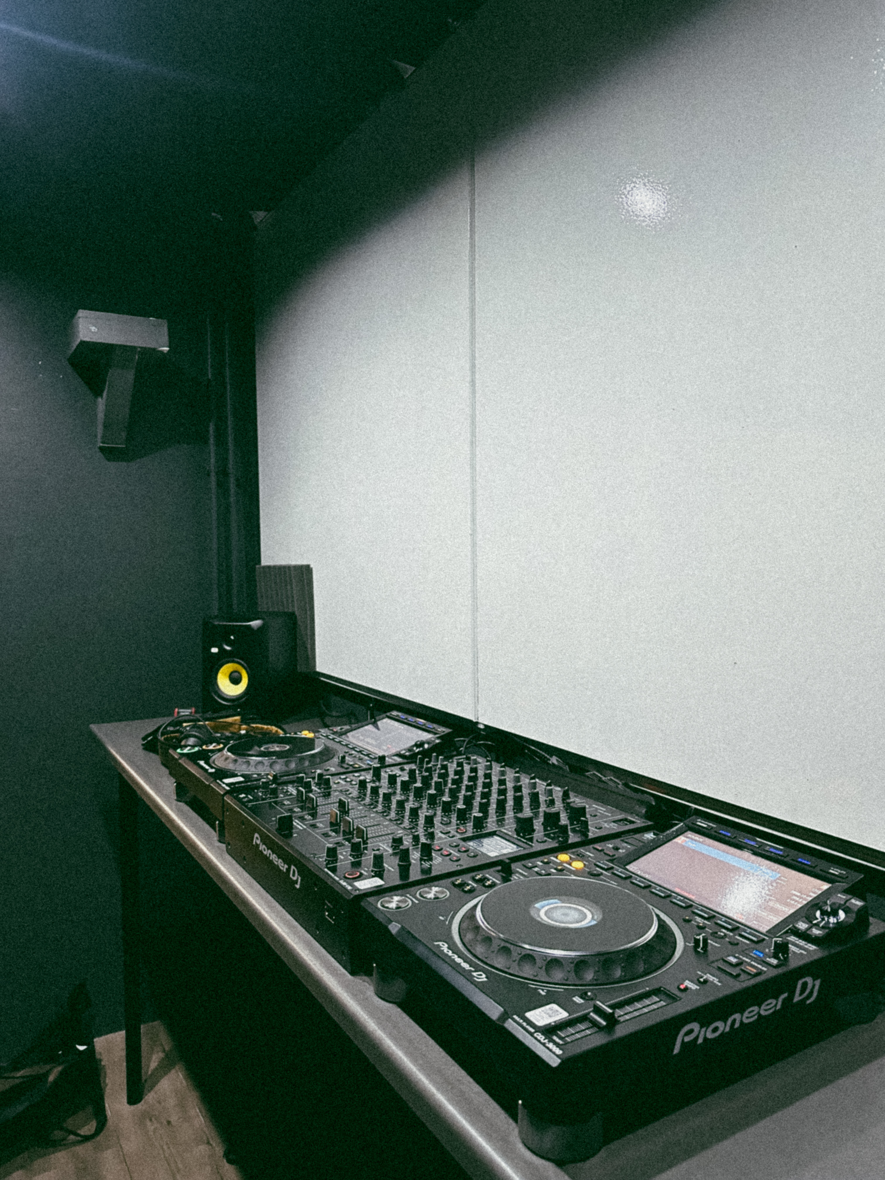 Ontdek STUDIO A, de ideale ruimte voor solo- of duo-oefensessies (maximaal twee personen). Deze studio is uitgerust met geavanceerde apparatuur, waaronder twee Pioneer CDJ-3000 spelers, een Pioneer DJM-V10 mixer, en twee Pioneer VM-70 speakers. Verfi