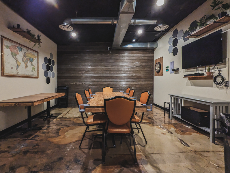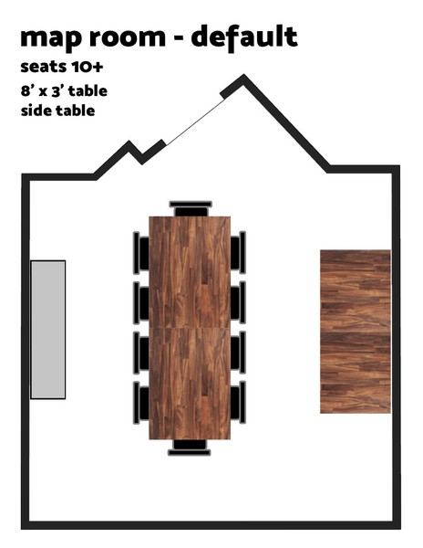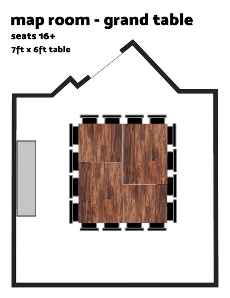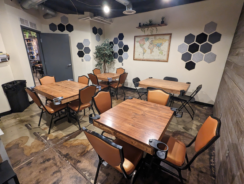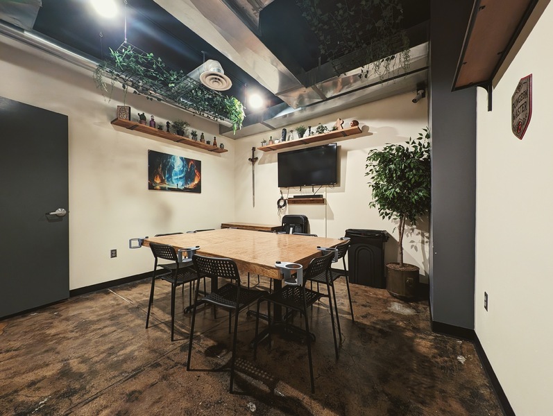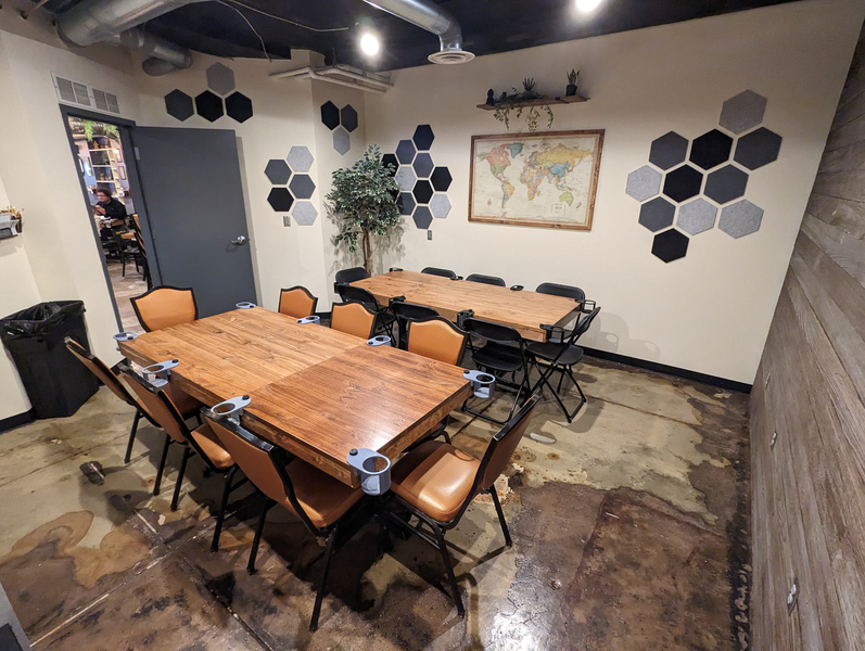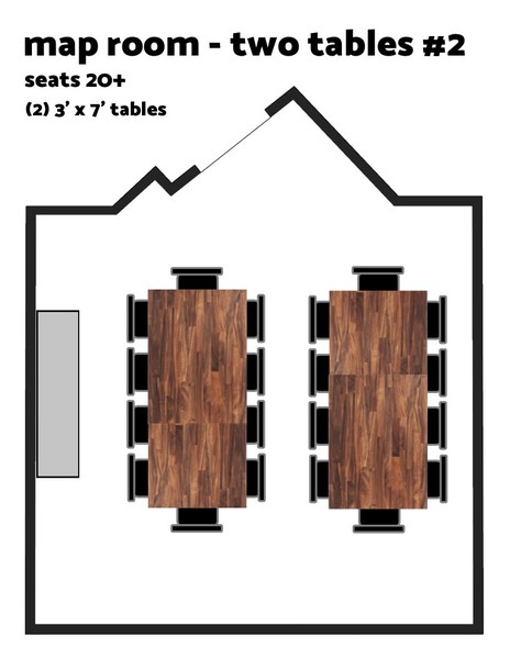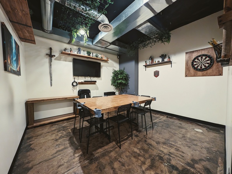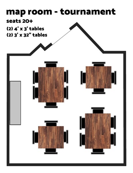 Both Private RoomsSeats 26+ (+ varies based on group comfort with close quarters)Table Setup: Map Room – 1 to 4 tables (variable setups) | Cave Room – Single large table 4' x 6'Amenities: TV, Bluetooth soundbar, dartsPolicies: Outside food & drin
