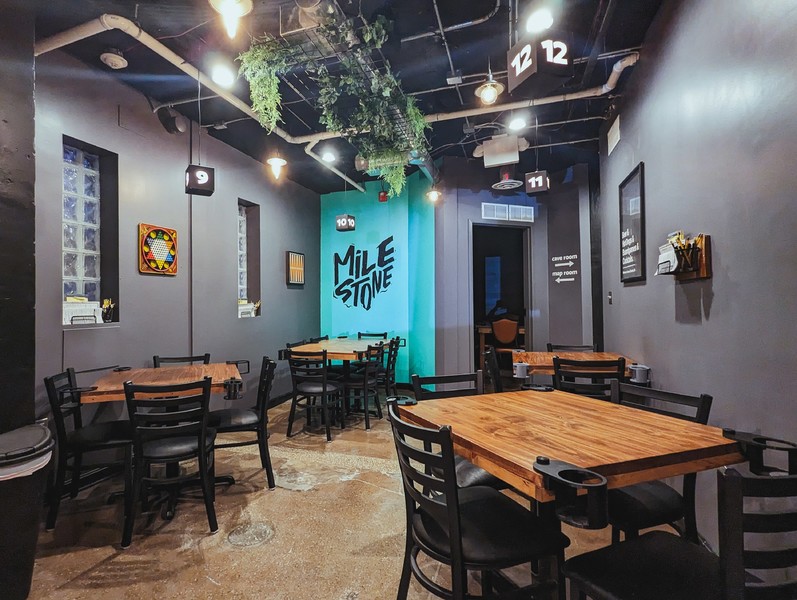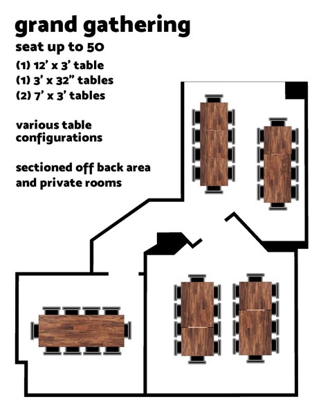 Sectioned off Back Area + Both Private RoomsSeats up to 50 | Many table layout configurations availableThe best option for groups of 30 or more. Great for corporate events, large team building exercises, tournaments, etc.Amenities include:TVs, Blueto