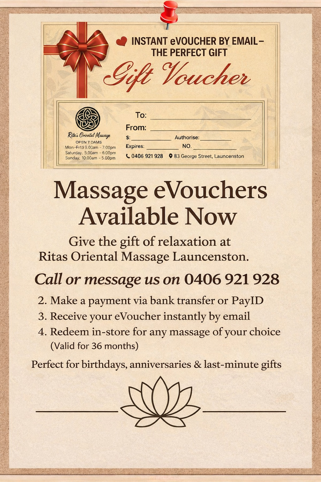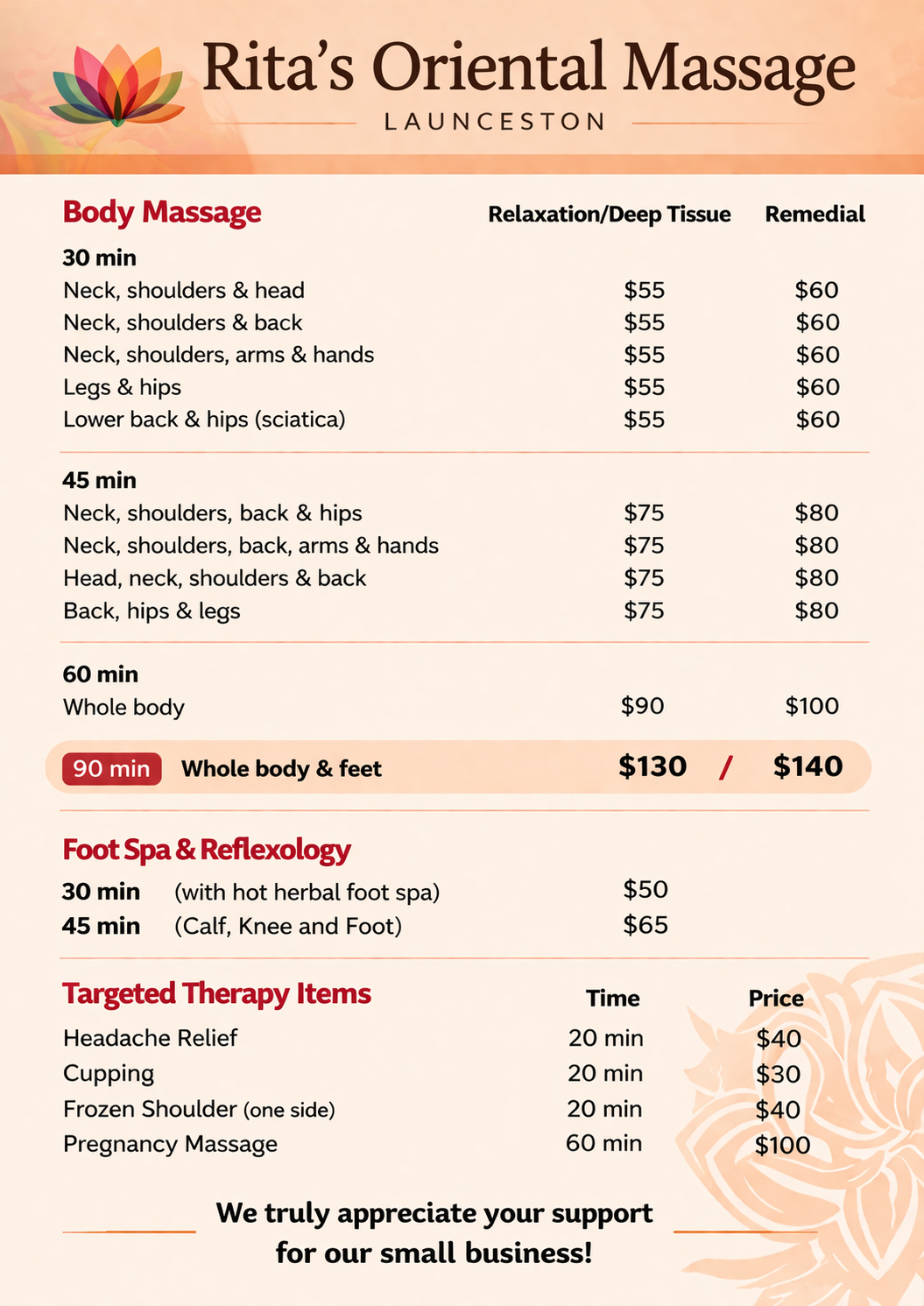 Rita’s Oriental Massage Launceston is your destination for relaxation, wellness, and rejuvenation in the heart of Launceston. Our experienced therapists provide personalized treatments designed to meet your unique needs—whether it’s deep relaxation, tension relief, or remedial care.We offer a range of services including body massage (dry, oil, remedial), whole body & feet treatments, foot spa & reflexology, and targeted therapy massage. Every session is delivered in a clean, tranquil, and welcoming environment, ensuring you leave feeling refreshed, balanced, and renewed.At Rita’s, we believe wellness should be accessible and enjoyable. Conveniently located with flexible appointment times, we make it easy for you—or someone special—to experience the benefits of expert care and personalised massage therapy.作品圖集