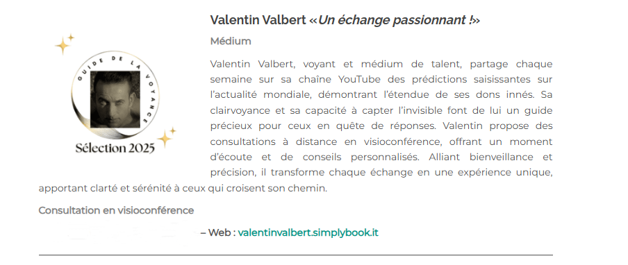 Bonjour, Je suis voyant et médium et ces dons sont innés. Je vous prouve chaque semaine sur ma chaîne youtube, valbertbelline, l'étendue de mes capacités et mon talent de clairvoyance. Je mets à votre disposition tout mon savoir faire dans le respect et l'échange. Nous essayerons ensemble d'entrouvrir la porte de votre futur et vous apporterai des réponses... Amicalement, Valentin VALBERT作品圖集